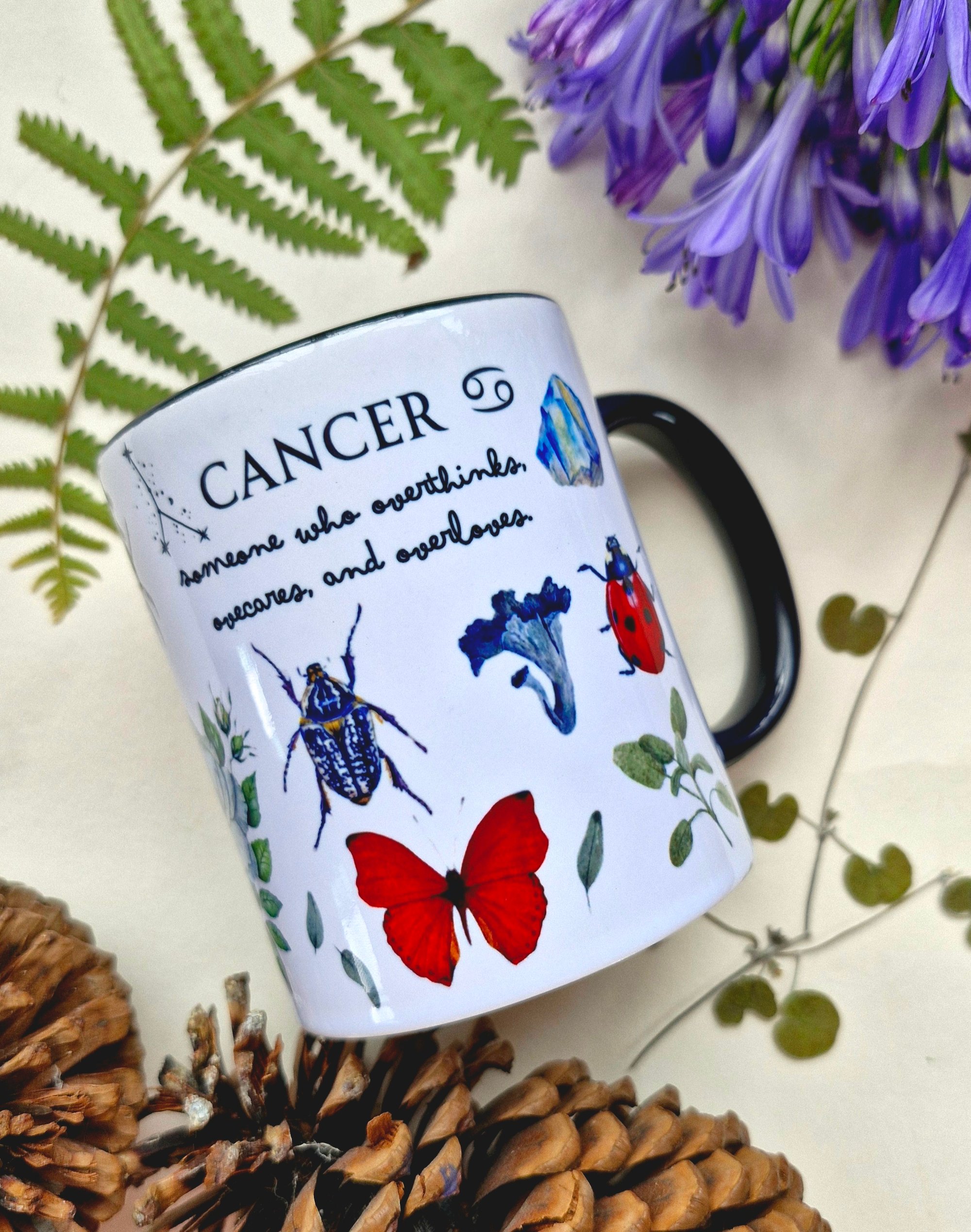 Featuring hand-painted butterflies, beetles, crystals, flowers, and a crab, this astrology coffee cup ☕ perfectly captures the Cancer sign’s essence — someone who overthinks, overcares, and overloves.