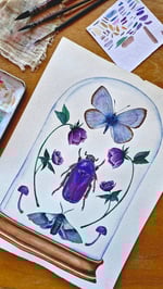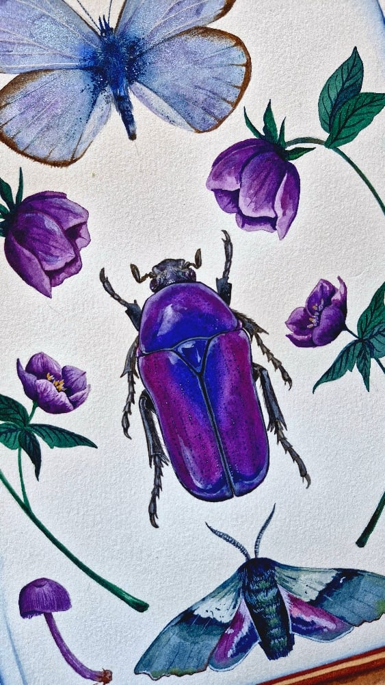 February is represented with luminous violet beetle, soft lilac wings, and blooming hellebore, the flower that always feels like February to me.