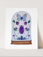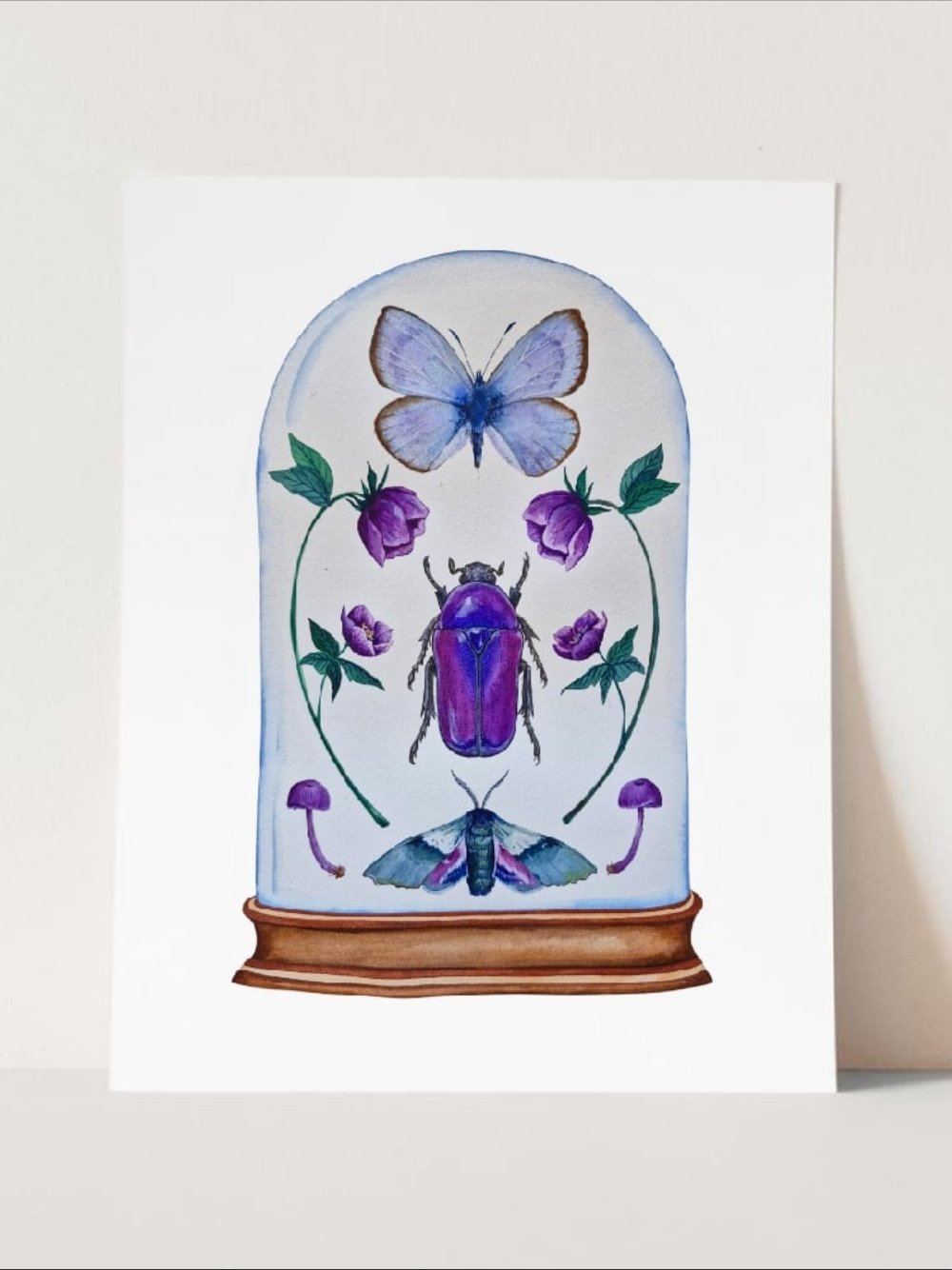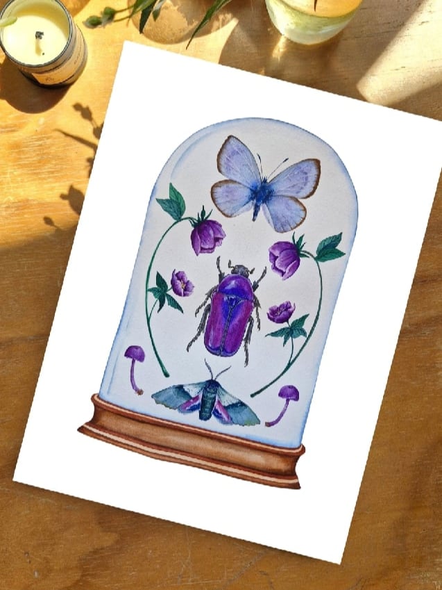 This artwork is a reproduction of my original watercolor painting, part of my new monthly collection, where each month is preserved inside a glass dome like an entomology treasure.