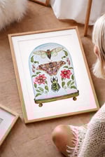 This piece captures the feeling of early spring through a delicate balance of insects and flowers, presented like a preserved natural specimen.