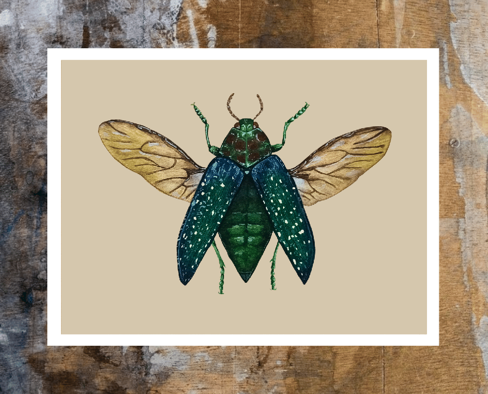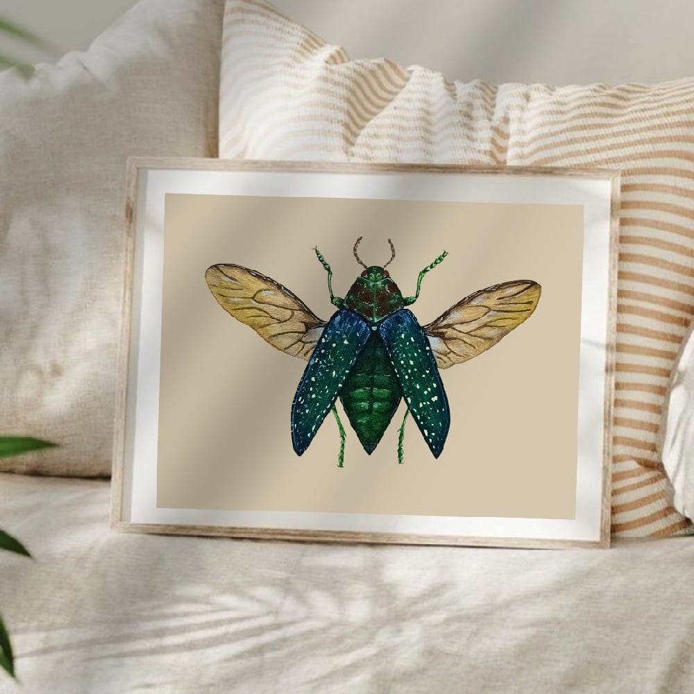 This print features the stunning Jewel Beetle, a native of Australia.
