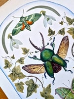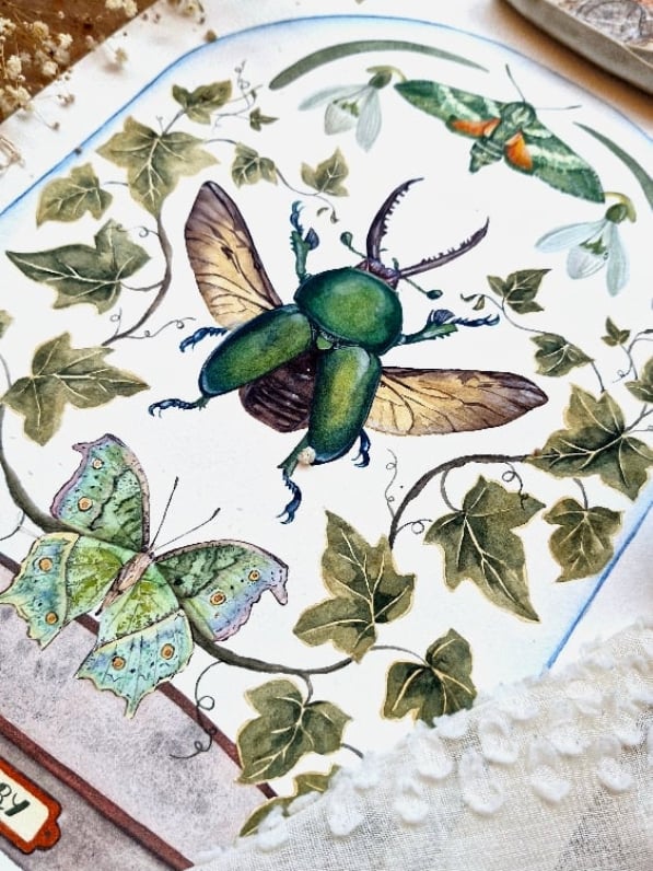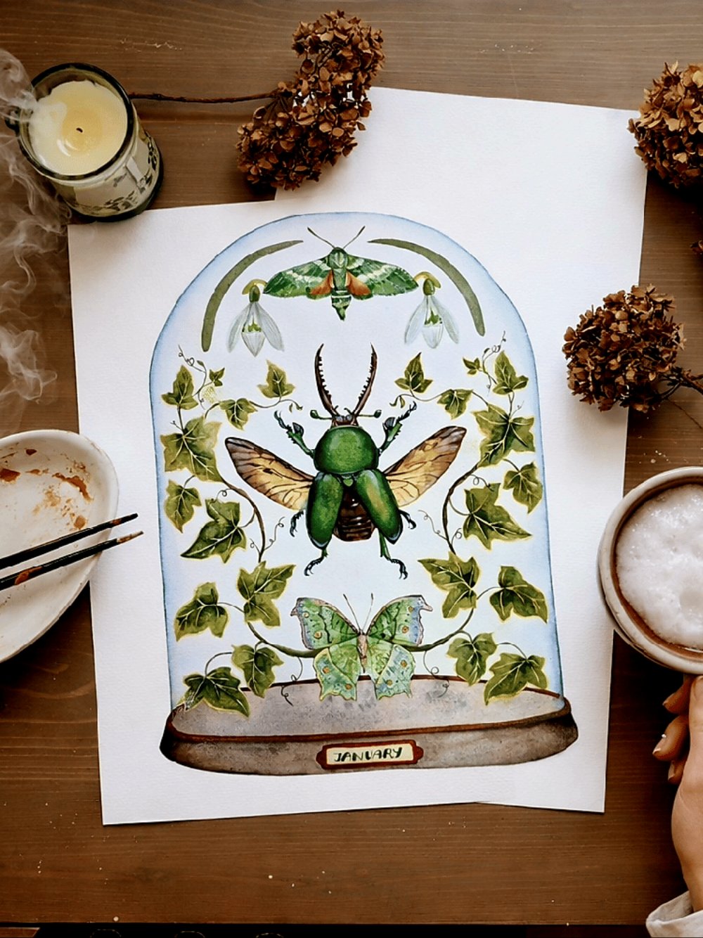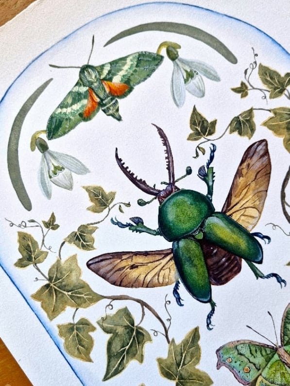 January is represented through a Lamprima Adolpinae, Ivy, and snowdrop flowers, symbolizing introspection, renewal, and the quiet life that continues beneath winter’s surface.