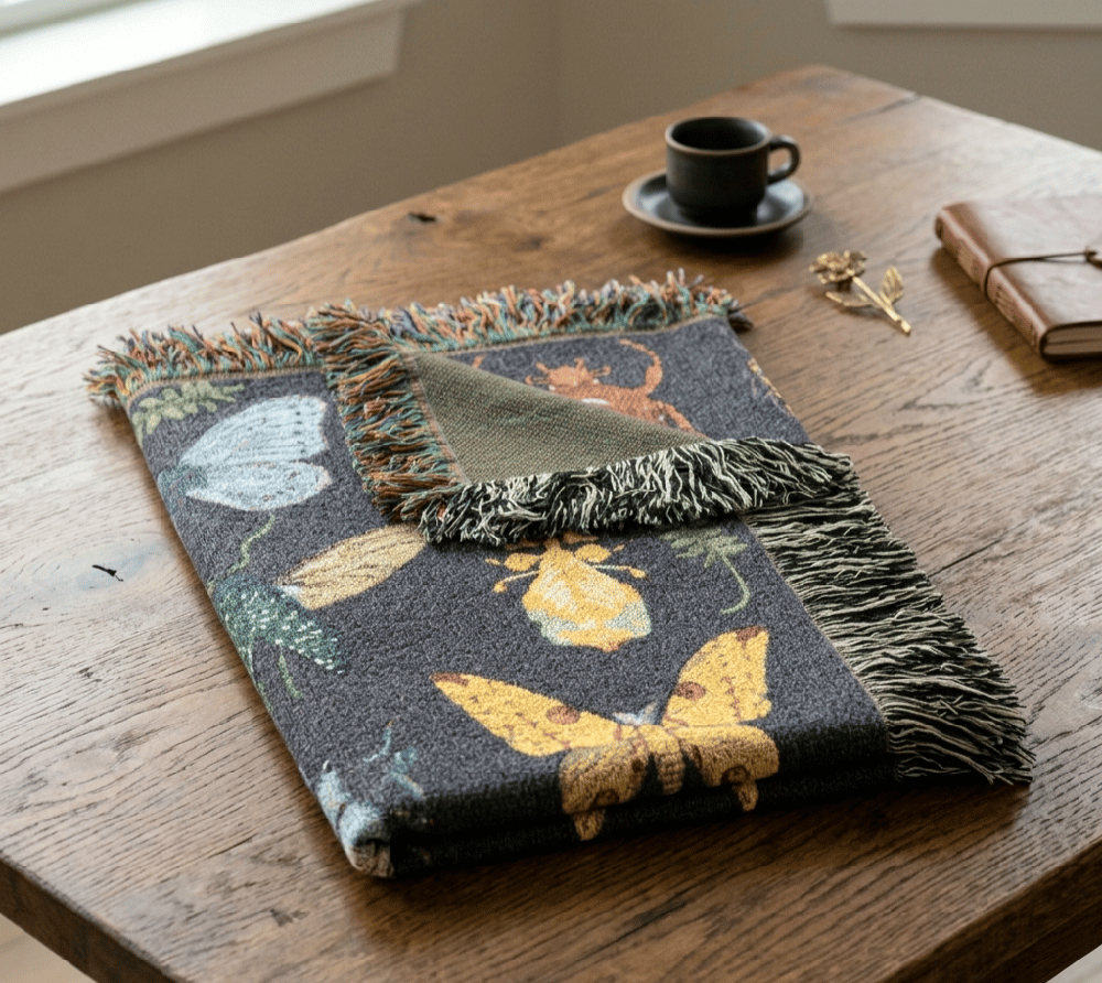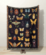 This woven blanket features a richly detailed arrangement of moths, beetles, and butterflies, reminiscent of antique specimen cabinets.